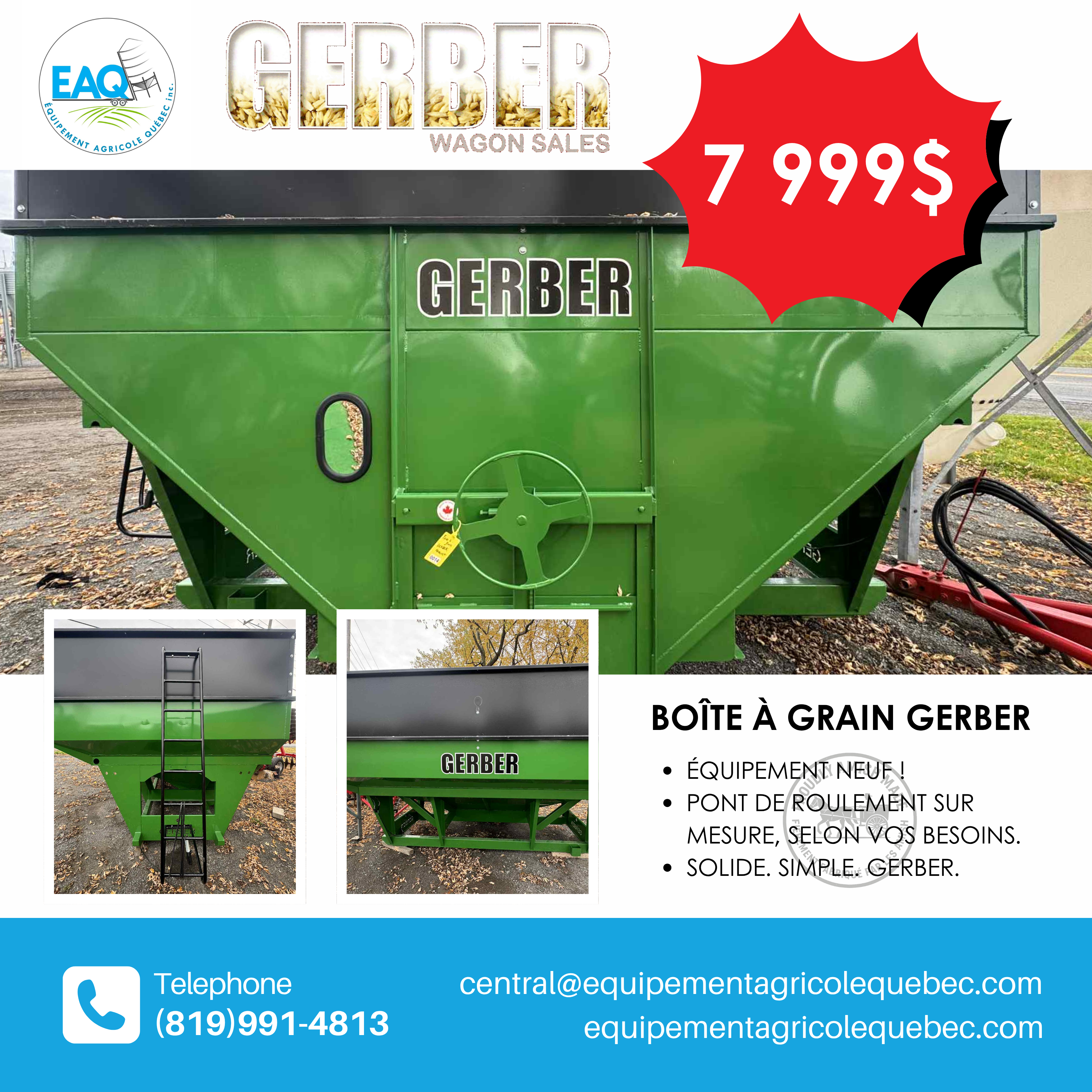 Boîte à grain Gerber 425 – capacité de 425 boisseaux, conception solide et durable. Déchargement rapide, stabilité exemplaire et performance éprouvée au champ.
