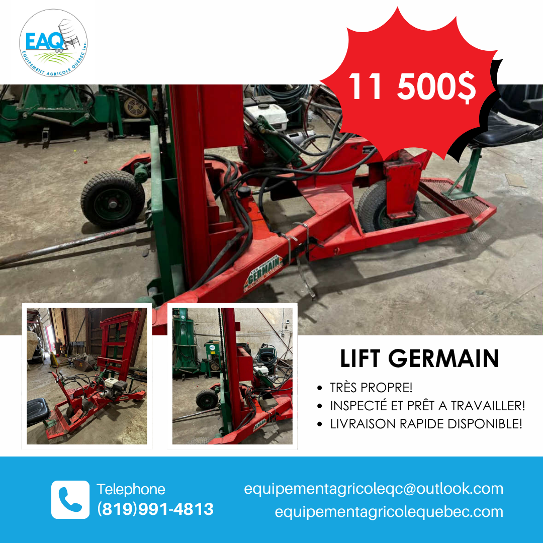 Lift Germain robuste et fiable, conçu exclusivement pour un usage agricole. Parfait pour faciliter le levage et le déplacement de charges dans les fermes et exploitations agricoles. Construction solide, durable et sécuritaire. Inspection complète effectuée, prêt à l’usage.